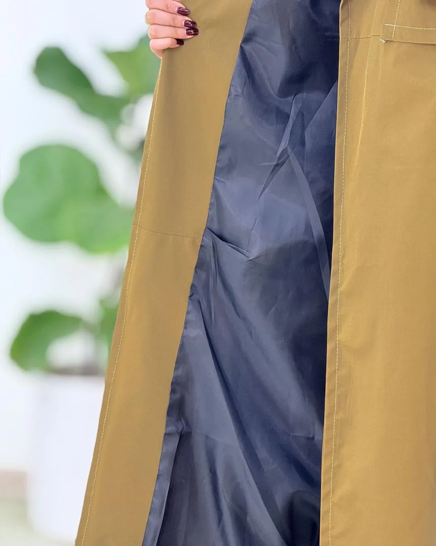 بارانی بلند بند دار یقه انگلیسی، انتخابی شیک و کاربردی برای روزهای بارانی و پاییزی است.