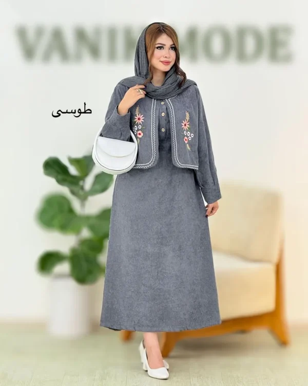 کت یقه گرد داره و جلوی کارش با گلدوزیهای زیبا تزئین شده که جلوهای خاص به استایل میده 🌸