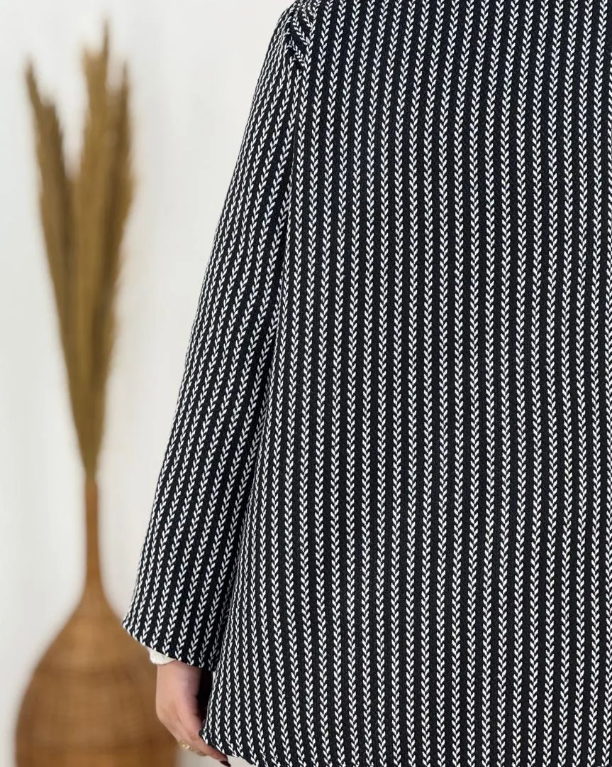 کت دارای یقه انگلیسی کلاسیک است که جلوهای رسمی و جذاب به استایل میبخشد و جلو باز طراحی شده تا بتوانید آن را بهصورت آزاد یا با کمربند استفاده کنید.