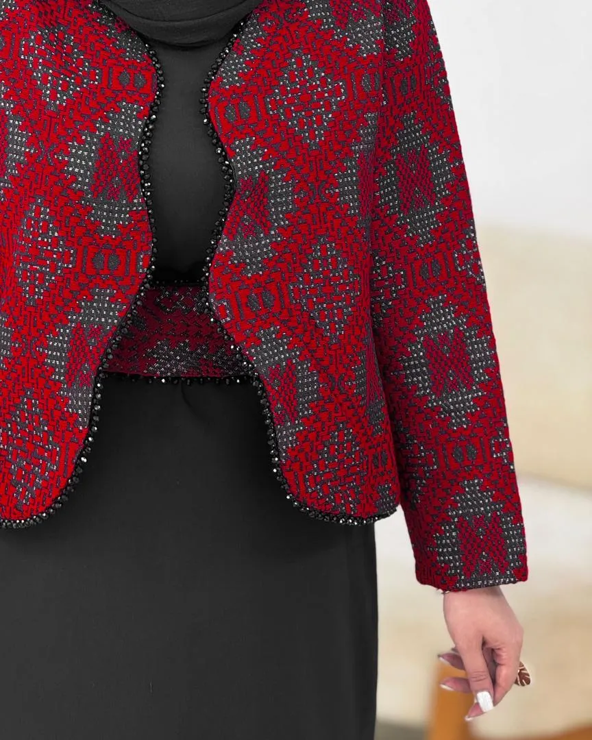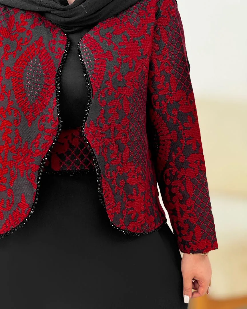 کت جلو باز طراحی شده و جلو و آستین‌هاش با سنگدوزی و طرح‌های خاص کار شده تا ظاهری جذاب و چشم‌گیر داشته باشه.