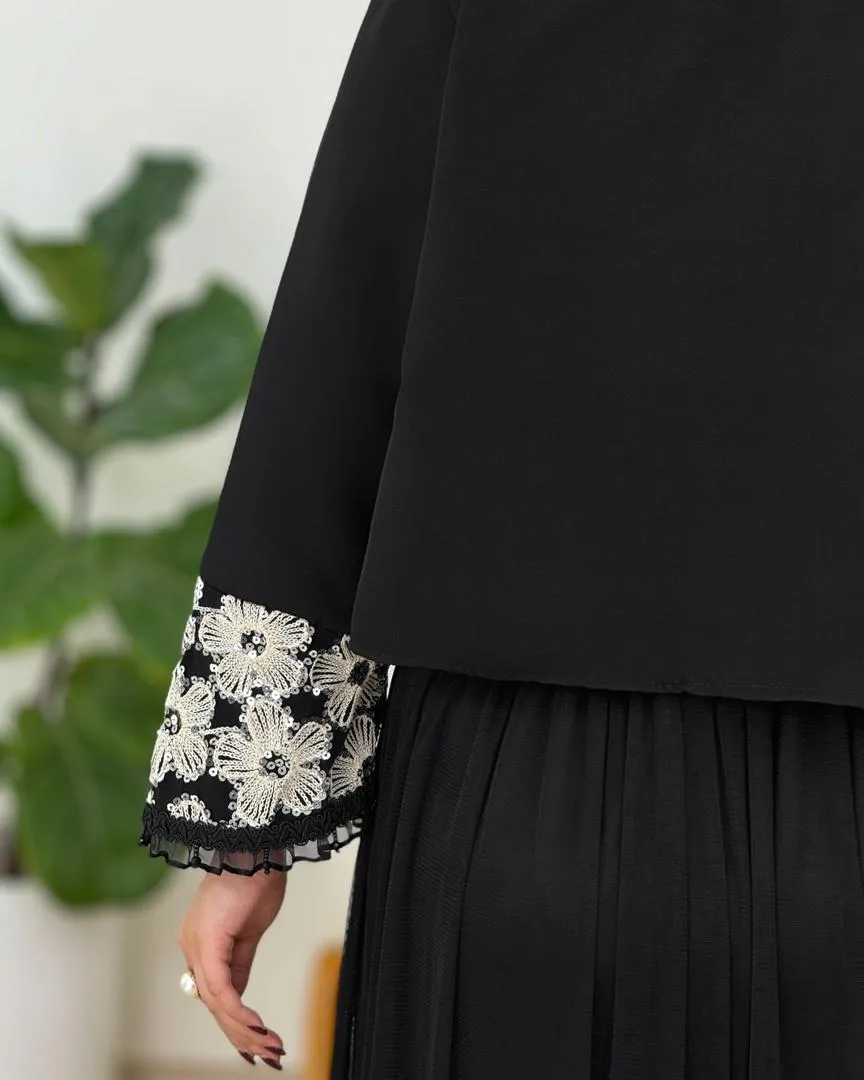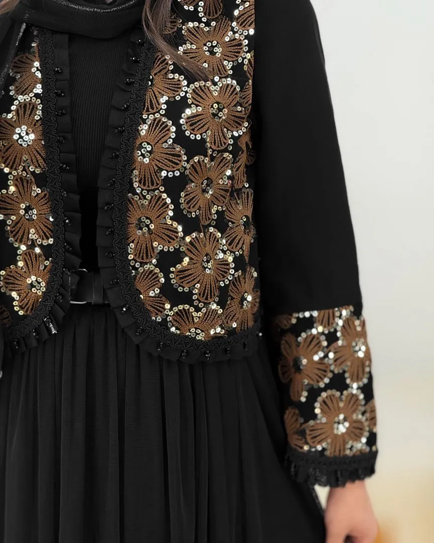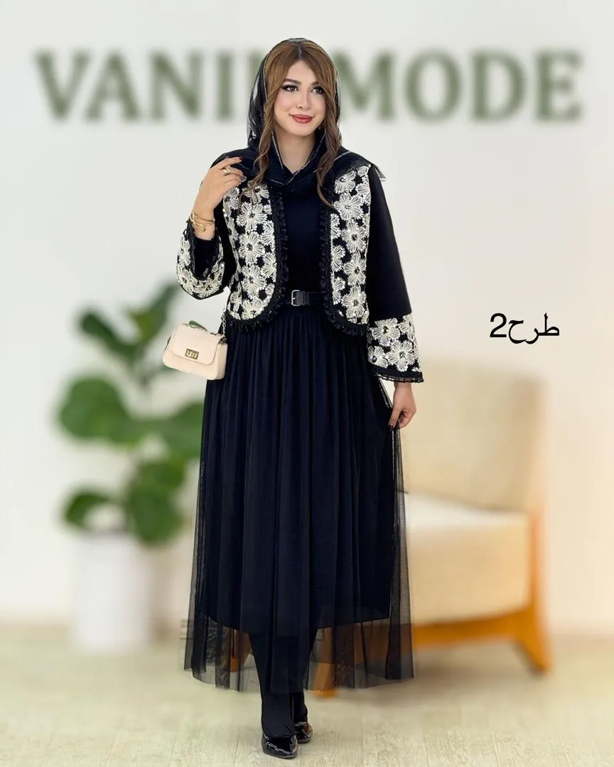 کت کوتاه طراحی شده و جلوی کار با پولکدوزی زیبا تزئین شده که جلوهای درخشان و چشمنواز به لباس میبخشد 🌟